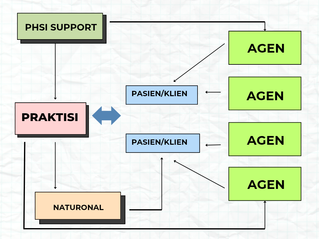 ⇒ PHSI, mensupport Praktisi dan Agen dengan bimbingan, sistem, tools, dan reward.